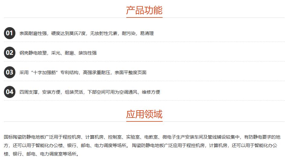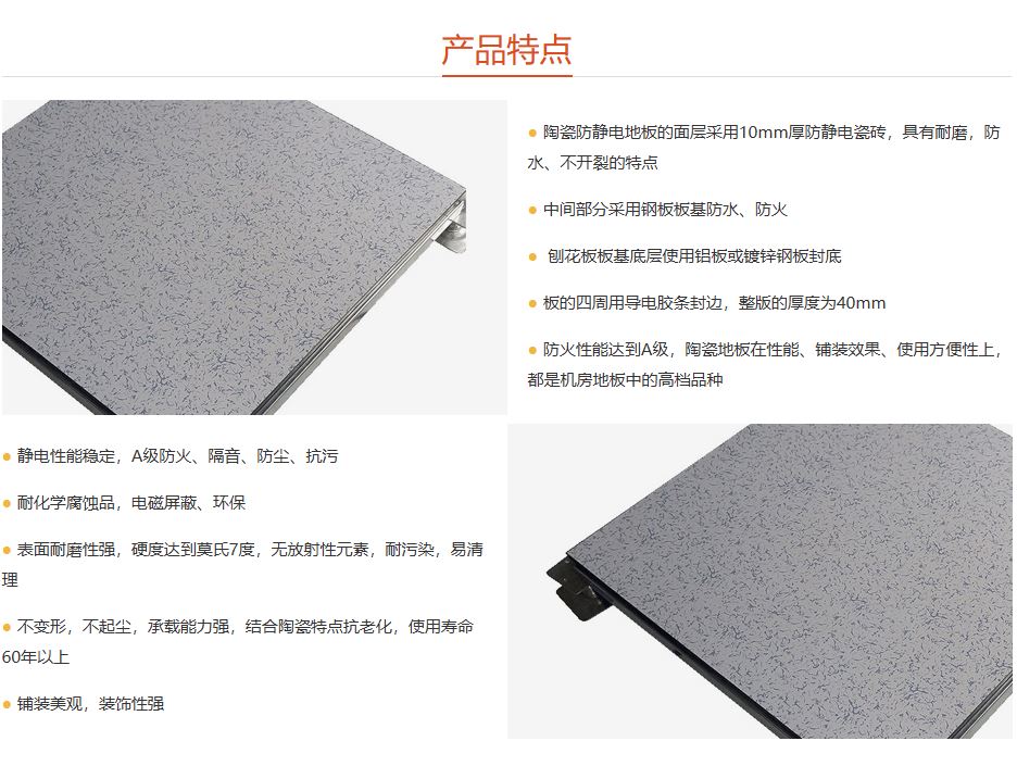 陶瓷防靜電地板主要包括防靜電瓷磚和鋼鐵材料為主體,經(jīng)特殊加工工藝制作而成,其特點(diǎn)為防靜電性能穩(wěn)定,耐磨耐腐、不發(fā)塵、抗污能力強(qiáng)、防火性能為A級等機(jī)械性能。施工方便,造價適中,具有較好的裝飾效果,廣泛適用于通信機(jī)房、計(jì)算機(jī)機(jī)房、指揮中心、潔凈廠房等要求凈化及防靜電場所。